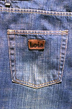 如果说处于左侧的Levis旗标像随风舞动的红旗.那么,LOIS的右侧旗标则像一枚红色的徽章,庄严、热情而醒目。在LOIS牛仔的铜质纽扣上.还是那头狂牛.它那浮雕的突起造型.灰旧的黄黑底色与光洁的铜黄色logo相互映衬,简洁完整地诠释了崇尚自我、自由、不拘一格的牛仔风貌。西班牙风情的牛仔无处不在地炫耀着它的“牛”. LOIS把它密密地锁缝在右胯的小袋上,独到之处在于你不能轻易地发现它,双手插兜才能触摸到它:敞开外衣.它就能在步履的节奏中.在轻摆的衣角边忽隐忽现.